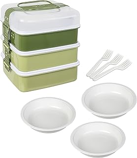 サンコープラスチック 弁当箱 ピクニックケース リオパック L型 3段 取り皿3枚・フォーク3本付き アースグリーン 約幅23.3×奥行22×高さ25cm