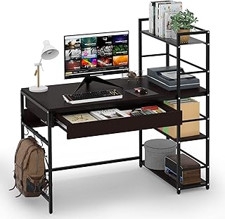 DomyHomeラック付きデスク パソコンデスク 机 PCデスク オフィスデスク 机 省スペース おしゃれ 収納 ワークデスク 書斎 メラミン加工 パソコン机 パソコンラック PCラック 木製 学習机 学習デスク 棚付デスク (Black, 120cm)